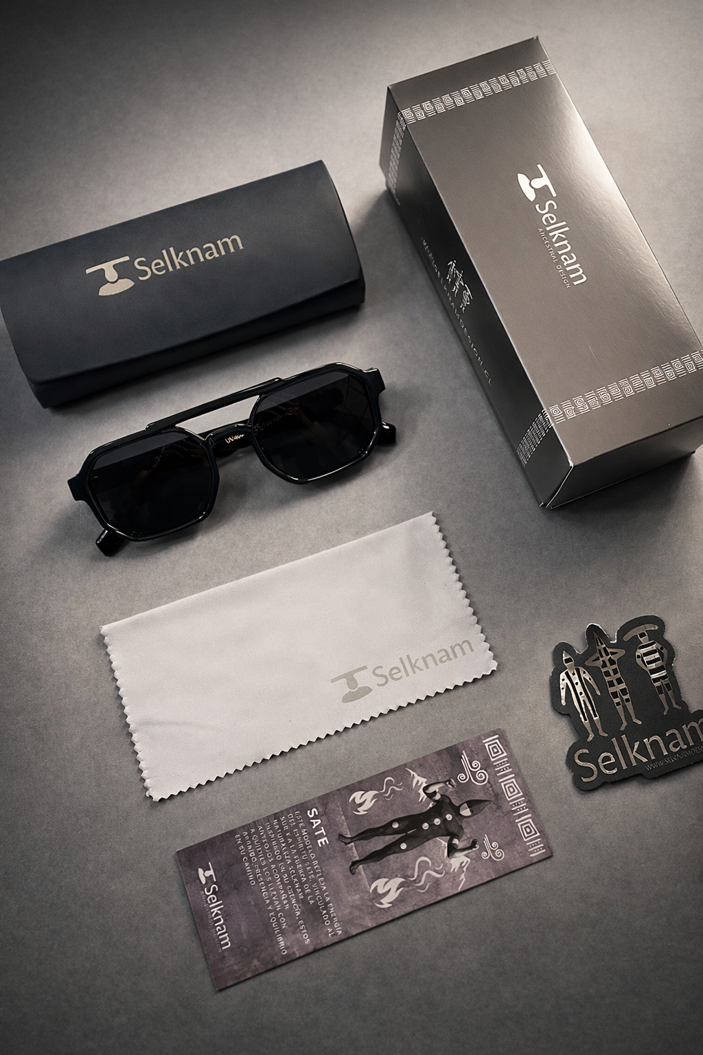 Cada modelo Selknam Eyewear se entrega con una presentación cuidada, pensada como parte de la experiencia de la marca.